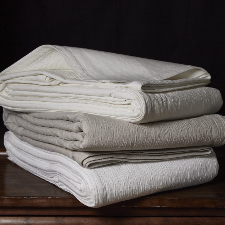 Alexa coverlets are our biggest runaway surprise! You will fall for the Kashmina soft blanket backing on Alexa and never look back. This is a must have piece that offers the warmth and softness of our very best blanket with the handsome finished look of an elegant coverlet. Alexa White and Ivory are made from pure cotton. Alexa Linen is undyed linen blended with cotton giving it a natural coloration derived from the natural color of the plant. Made in Portugal exclusively for TL at Home. Stocked in our Hudson, NY warehouse. Dutch Shams are made to order.