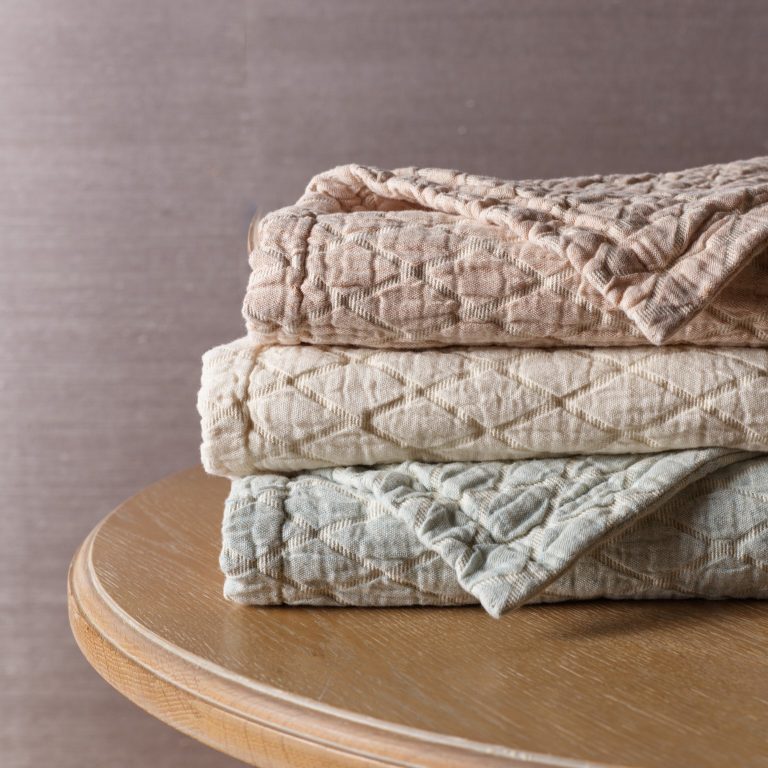 Boyce is a dyed cotton linen blend coverlet with an all over diamond design featuring variations in the channels. The dyed linen content gives these pieces a heathered color which makes their signature style visually interesting. As usual, with our stone washing process, you get a very soft hand, with lots of texture and great rich color. Stocked in our Hudson, NY warehouse. Dutch Shams are made to order.