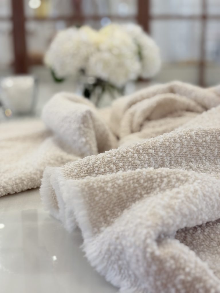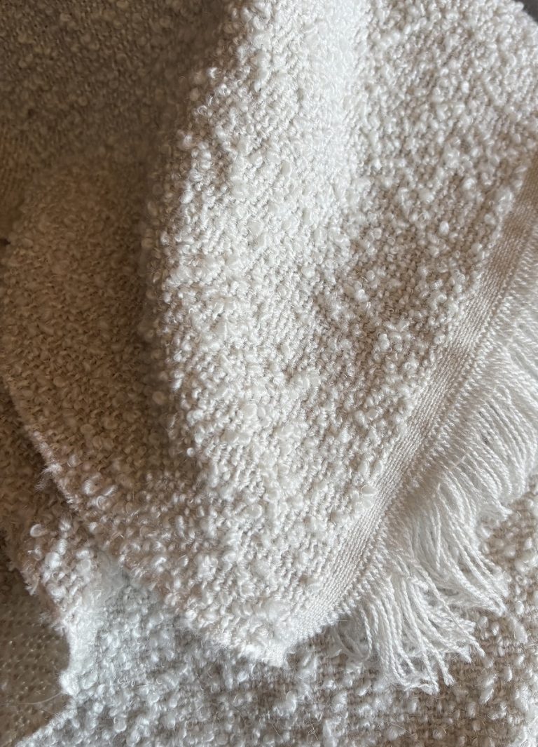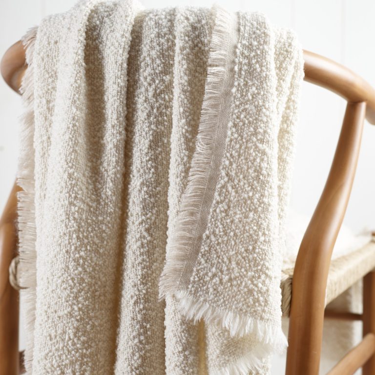 Woven in Turkey from a soft wool-acrylic blend, the Elspeth ivory throw strikes the perfect balance of warmth and lightness. Boucle yarns give it a beautiful texture that feels modern yet timeless – perfect for today’s lifestyle. Finished with fringes on two sides, it’s ideal for your favorite reading chair or wrapped around your shoulders on a chilly evening. A thoughtful gift, and stocked in our Hudson, NY warehouse in a generous 55×66 size.