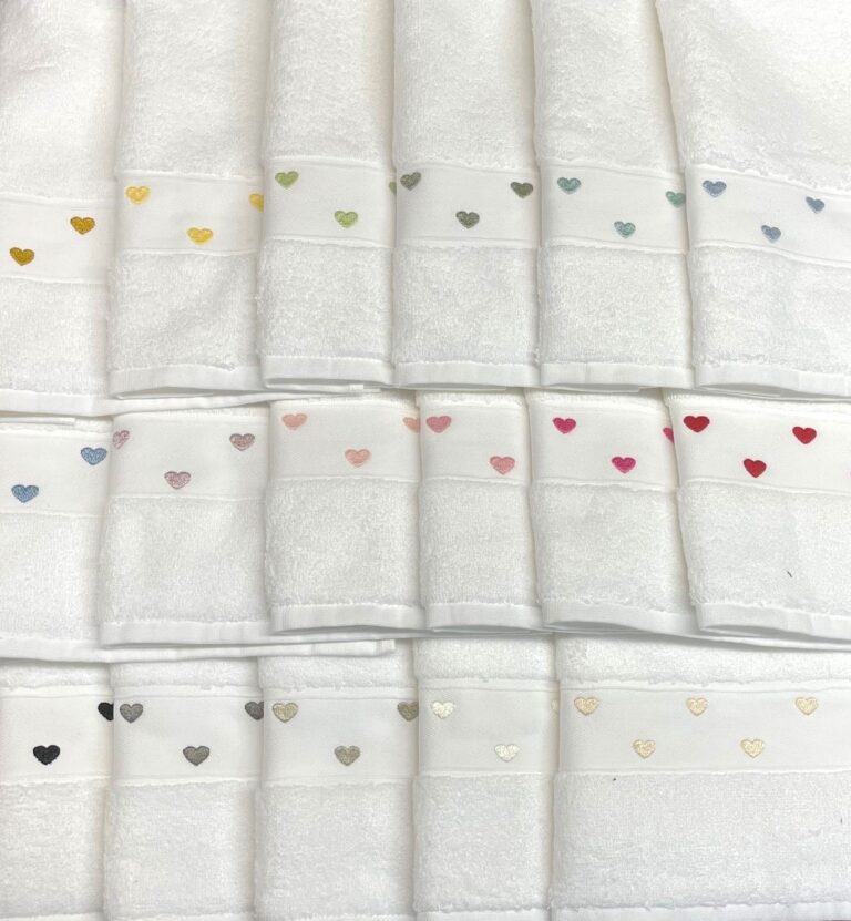 LOVE Embroidered Towel Collection features the a charming heart embroidery in our selection of 38 colors. Our 500 gsm terry towels feature “just right” thickness so they’ll dry quickly making them an environmentally friendly choice. Made exclusively for TL at Home in Portugal.